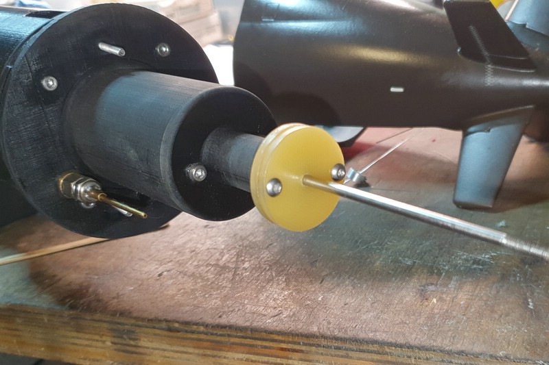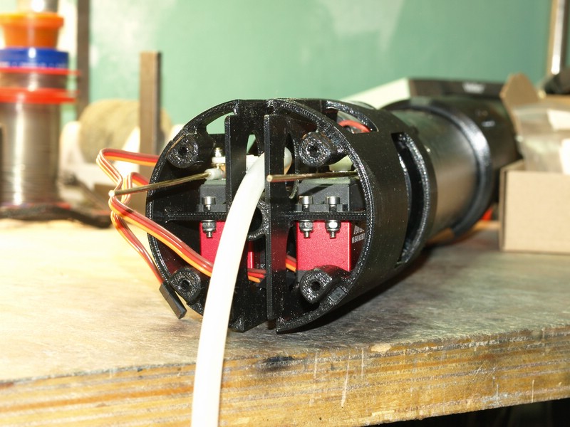 Weshalb ich jetzt noch überlege die gedruckte Konstruktion raus zu werfen und durch Gewindestangen zu ersetzen. Somit könnte ich dann auch die Servos so platzieren, dass die Kugelköpfe nicht mehr zum Servogehäuse zeigen und dort anschlagen können. Eventuell käme sogar ein Wechsel auf Miniservos in Frage, was das Gewicht im Heck wieder kompensiert.