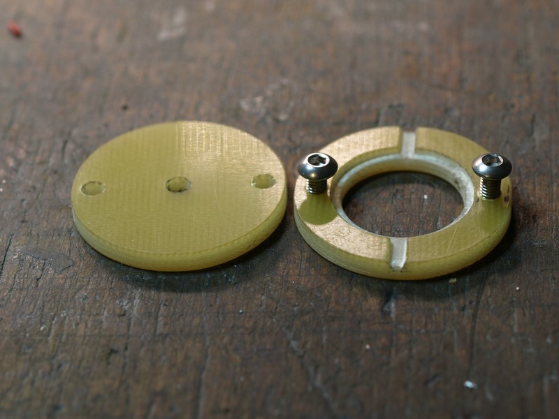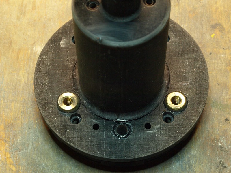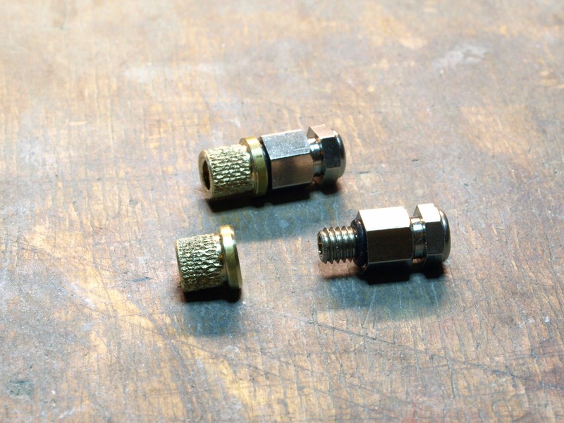 Im nächsten Schritt kamen die Gestängedurchführungen dran. Da habe ich mir aus Messing 2 Adapter gedreht, damit ich die Stopfbuchsen schön einschrauben kann. Der Druckkörperdeckel ist mit Bajonett in Resin gedruckt. Da habe ich die Löcher für die Gestängedurchführung vorsichtig aufgebohrt, und die Adapter eingepresst und verklebt. Erst mit Uhu Endfest 300, welcher aber keine gute Verbindung mit dem Resin einging. Habe dann dünnflüssigen Sekundenkleber genommen und das hält.