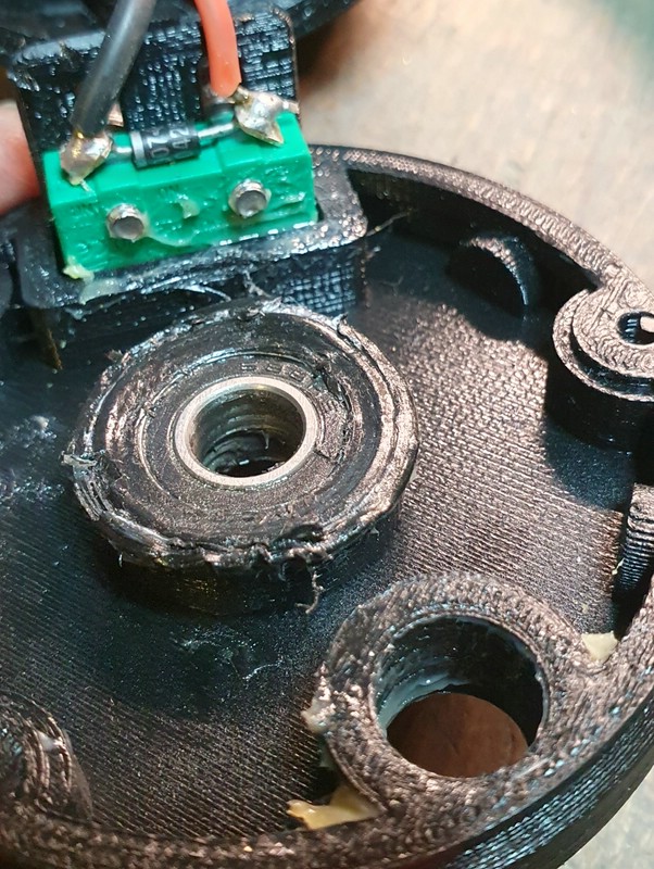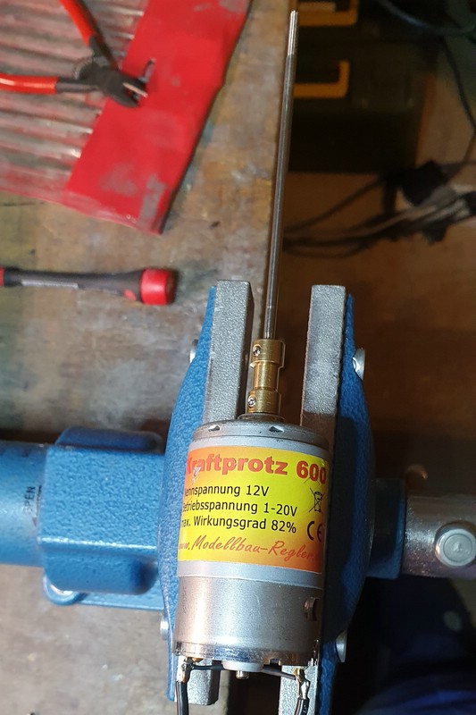 Nun kam der Motor an die Reihe. Im Lieferumfang ist ein Johnson 01604 12V enthalten. Dieser war bei mir allerdings fest und lies sich nicht drehen. Nach aufschrauben der Direktkupplung auf die Motorwelle, um die Motorwelle besser drehen zu können,  löste sich der Anker unter einem Knack. Es fühlte sich so an als wäre das Harz, mit dem die Wicklungen vergossen werden, an das Motorgehäuse gelaufen und hätte sich dort verklebt. Nach Anschluss ans Netzteil und dem Motor in der Hand hatte ich dann auch einen Vibrator… er lief einfach unrund. So habe ich bei Modellbau-Regler.de den 600er Kraftprotz bestellt. Der ist etwas Länger und mit dem Rückschlussring im Durchmesser ein bisschen größer. Der Ring kann abgenommen werden, aber er passt auch so gerade noch in die Motoraufnahme. Es liegen dem Baukasten 3 Entstörkondensatoren bei. Allerdings sind alle 10nF und mit kurzen Beinchen. Entstört wird mit 10nF jeweils von Pol zum Gehäuse und mit 47nF von Pol zu Pol.