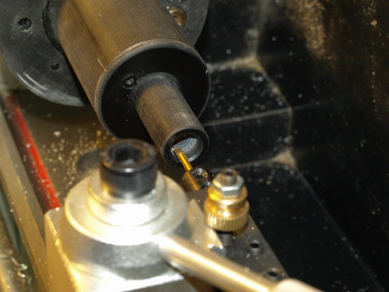 Die Madenschrauben in der Kupplung wurden auch gleich von den schwarzen Stahlschrauben zu Edelstahlschrauben gewechselt. Im nächsten Schritt sollten Messingrohrstücke als Wellenlagerung in den Druckkörperdeckel sowie im Heckkegel eingeklebt werden. Im Heckkegel habe ich das auch gemacht. Aber im Druckkörperdeckel, direkt vor dem Simmerring habe ich mir einen Lagersitz mit Flansch aus Alu zur Aufnahme eines Kugellagers gedreht. Dazu musste auch der Druckkörperdeckel ausgedreht werden. So habe ich diesen auf meine Drehbank aufgespannt, die Rundlaufungenauigkeit gemessen und das Ganze um die Rundlaufungenauigkeit größer ausgedreht. Das Kugellager wurde dann später mit dem Einbau von Motor und Welle eingeklebt, damit die Flucht stimmt.