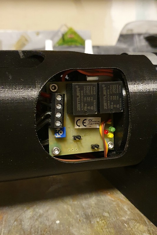 Jetzt konnte die Elektronik verdrahtet werden. Dem Lagerregler habe ich noch ein Gehäuse gedruckt und im vorderen Segment des Technikgerüstes verbaut. Vorne sitzen dann auch der Akku, das BEC, die Rückfahrerkennung für den Lageregler und der Empfänger. In das hintere Segment kommen zu den Servos noch der Fahrtregler und die Kolbentanksteuerung. Angeschlossen am Netzteil wurde noch die Schwellspannung der Kolbentanksteuerung eingestellt, damit sie auch entsprechend dem LiPo bei ca. 9,5V den Tank auf lenzen schaltet. Beim Einbau musste ich dann feststellen, dass die Befestigungspunkte im Technikgerüst mit gedruckt waren und für die Brüggen BTS sind. Diese habe ich mit dem Drehmel weggeschliffen und mir eine passende Befestigung gedruckt und wieder mit Sekundenkleber eingeklebt.