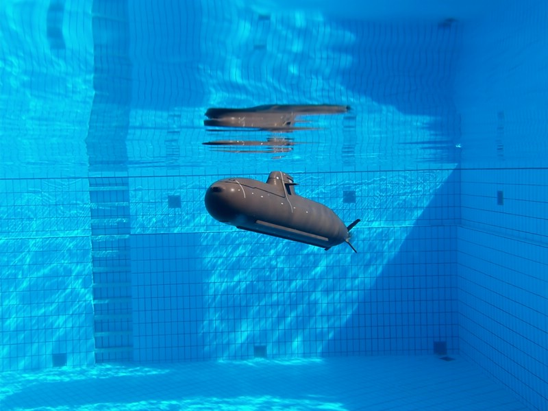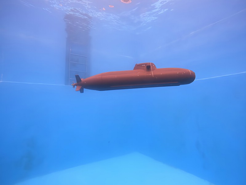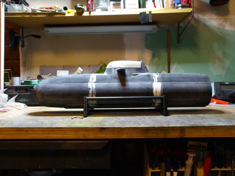 Nachdem nun die Technik soweit fertig war ging es an den Rumpf. Dieser besteht aus fünf Segmenten. Alle wieder in Resin gedruckt. 3 Teile ergeben den Bugbereich mit Druckkörper, ein Teil ist das Heck und das letzte Teil ist die Turmkappe und klar gedruckt. Von innen findet man in der Turmkappe auch die Umrisse für die Ausfahrgerät-Öffnungen. Somit kann man schön präzise Durchbrüche schaffen wenn man gerne Ausfahrgeräte anbringen möchte. Ich habe darauf verzichtet, da sie im Betrieb doch schnell abbrechen. Vorne in der Bugspitze ist ein frei durchfluteter Bereich, da ist an der Unterkante die Wandstärke wohl etwas dünn geraten, wie ein Lichttest zeigte. Hält bis jetzt aber.