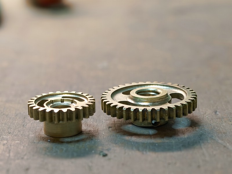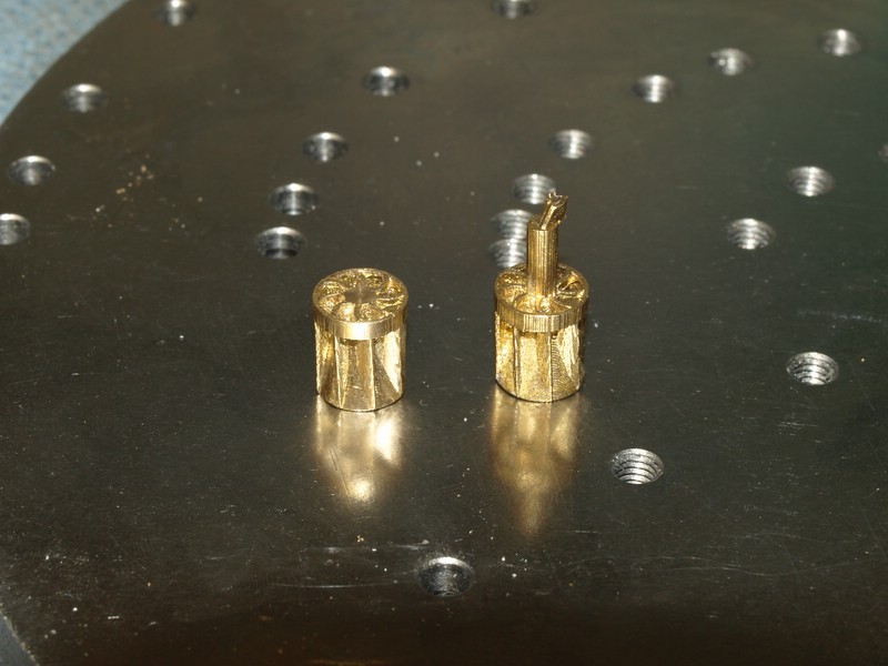 Um einem weiteren Ausfall vorzubeugen gab es Messingzahnräder. Diese mussten aber noch ein wenig optimiert werden. Als erstes war Achsabstand und die Untersetzung wichtig. Der Achsabstand beträgt 24mm und die Untersetzung 1,58:1. Bei GHW-Modellbau wurde ich fündig und bestellte mir geradeverzahnte Zahnräder Modul 0,8 mit 24 und 36 Zähnen. Was einer Untersetzung von 1,5:1 entspricht und zum Achsabstand passt. Jetzt waren die Zahnräder natürlich um einiges schwerer als die gedruckten. Zudem war bei dem motorseitigen Zahnrad der Flansch größer im Durchmesser und beide Zahnräder hatten nur eine 4mm Bohrung. Als erstes bekam das große Zahnrad auf der gegenüberliegenden Seite des Flansches noch ein 0,8mm Messingblech hart aufgelötet. Das Dient später als Anlaufring gegen eins der Kugellager, damit das Zahnrad nicht wieder mit der ganzen Fläche am Lagersitz reibt. Das ist zwar auch nicht die perfekte Lösung, da so die Kugellager axiale Kräfte aufnehmen müssen, während sie eigentlich nur für radiale Kräfte gemacht sind. So können mit der Zeit die Kugeln einseitig einlaufen. Aber selbst mit eingelaufenen Kugeln kommt das U-Boot wieder hoch, mit einem aufgeschmolzenen Zahnrad nicht. An der Drehbank, eingespannt in ein entsprechendes Spannzangenfutter, wurde dann das Motorzahnrad für die Motorwelle auf 6mm ausgedreht. Das andere wurde auf 6,4mm ausgedreht und bekam anschließend eine M8 Gewindebohrung mit dem Gewindebohrer. Die neuen Bohrungen müssen natürlich mit einem Senker entgratet werden. Im nächsten Schritt drehte ich mir eine Messinghülse um das große Zahnrad im Dreibackenfutter spannen zu können. Denn die Nabe und das aufgelötete Blech mussten noch etwas abgedreht werden.  Mechanisch wäre jetzt alles fertig, aber ich wollte die Zahnräder noch etwas auf Diät setzen. So kamen sie mit dem Teilapparat unter die Fräse und es wurde noch Material heraus gefräst. Aus 4mm Vollmaterial wurde beidseitig 1mm tief eingefräst. Wichtig ist, dass der Übergang zur Nabe und zum Zahnkranz mit einem Radiusfräser gemacht wird. So werden die Kräfte besser übertragen. Um noch etwas Gewicht zu reduzieren habe ich ein paar Langlöcher eingefräst. Zum Schluss muss natürlich alles entgratet werden, was mir wunderbar mit einer Stahltopfbürste von Proxxon für den Drehmel gelang. Jetzt bekam das Motorzahnrad noch eine M3 Bohrung in die Nabe um auf der Motorwelle fixiert werden zu können. Natürlich mit einer M3 Madenschraube aus Edelstahl. Den Tauchtankdeckel musste ich mir auch neu drucken um mit der größeren Nabe des Motorzahnrades dort hinein zu kommen. Ein abdrehen der Nabe war leider nicht möglich, da dann nicht mehr genug Material für die Madenschraube zur Verfügung gestanden hätte.