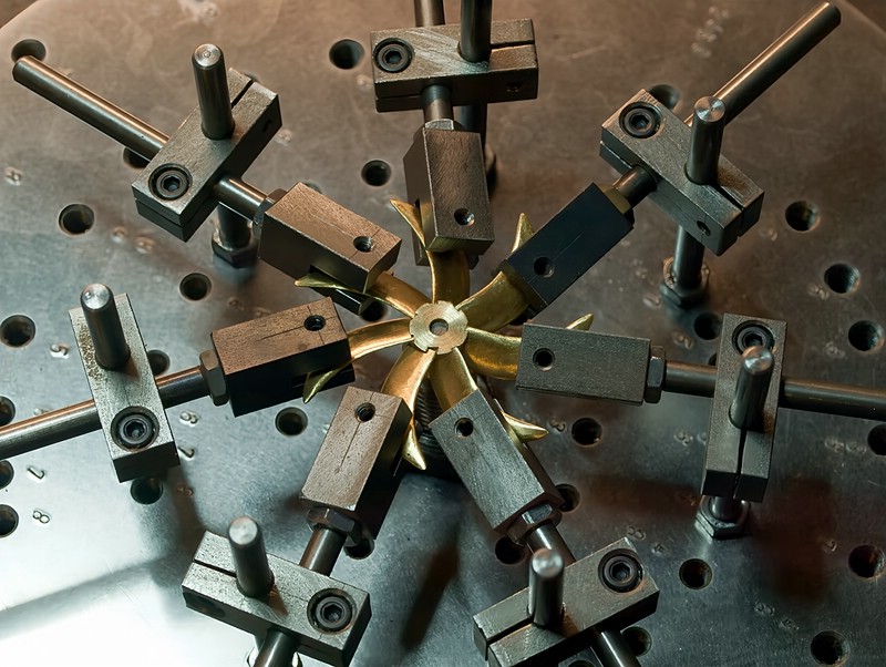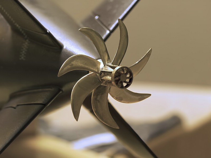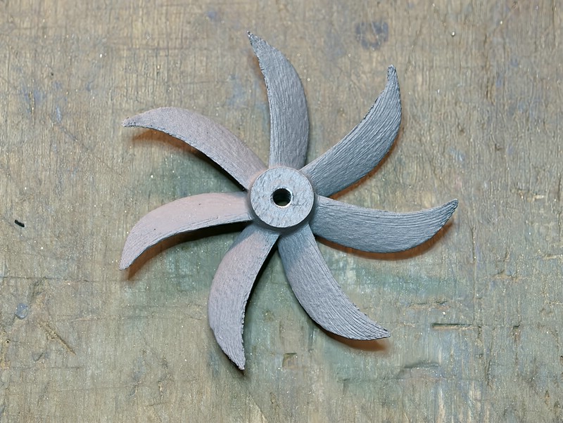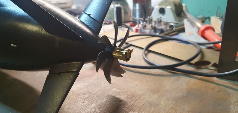 Damit ich den Deckel entsprechend anbringen konnte, mussten die Antikavitationsdüse und der Propeller von der Welle. Und spätestens jetzt wäre das filigrane Druckteil der Düse zu Bruch gegangen. So konnte ich durch erwärmen die Schraubensicherung lösen, allerdings war der Propeller weniger über die Wärme erfreut. Somit stand für den Winter 2024-2025 fest, es wird ein Messingpropeller gebaut. Ein Kollege hat mich da gut unterstützt und er meinte, solle ihn mir doch bei https://jlc3dp.com in Edelstahl drucken lassen. Ich wollte beides versuchen. Der Selbstbau dauerte länger, da auch erst ein Hartlötgerät angeschafft und eine Lötvorrichtung gebaut werden musste. Ich kann nur sagen der Greggersen Micromax ist ein geiles Gerät zum hartlöten, Hartlot und Flussmittel habe ich von Fohrmann-Werkzeuge. Die Nabe wurde entsprechend gedreht, dann auf der Fräsmaschine kamen - eingespannt im Teilapparat - die Schlitze für die Blätter in die Nabe. Die Blätter selbst habe ich aus 0,8mm Messingblech mit der Laubsäge ausgeschnitten. Alle 7 Blätter wurden aufeinander gelötet und in Form gebracht. Danach wieder entlötet, das Lötzinn entfernt und die Blätter entsprechend der Steigung gebogen. Zuerst machte ich mir ein Musterblatt, habe das gut eingefettet und mit Spachtelmasse bestrichen. So hatte ich eine Lehre für die 7 Blätter. Das Muster hebe ich auf um später weitere Blätter für eventuell anfallende Reparaturen machen zu können. Anschließend wurden die Blätter profiliert. Da arbeitete ich auch mit einer Waage, welche auf 0,01g auflöst. So konnte ich mir tatsächlich ein späteres Wuchten des Propellers sparen. Die größte Abweichung bei den 7 Blättern waren 0,02g. Im Nachhinein würde ich die Blätter aus 1-1,5mm dickem Messing machen, da sie nach dem profilieren noch stabiler sind und sich auch sicherlich besser löten lassen, da sie nicht so schnell ausglühen als meine aus 0,8mm Blech. Jetzt kam alles in die Lötvorrichtung und wurde entsprechend verlötet. Danach ging es dann in ein Entkalkungsbad. Man löst eine der Entkalkungstabletten für Kaffeemaschinen in Wasser auf und legt den Propeller für 24h hinein. Ich habe gelegentlich alles einmal umgerührt. Das machte ich um die Flussmittelreste zu lösen, die sonst über die Zeit unschöne Spuren auf dem Messing hinterlassen. Danach wurde nochmal alles verputzt. Erst mit Feile und Schmirgelpapier, danach mit den Stahlbürsten für den Drehmel. Der Edelstahlpropeller war erst beim zweiten Druck den Vorstellungen entsprechend. Da sollte man auch gleich das Gewinde mit drucken lassen und es dann später einmal nachschneiden. Er muss natürlich noch nachbearbeitet werden, aber für rund 15€ inkl. Versand echt ok.