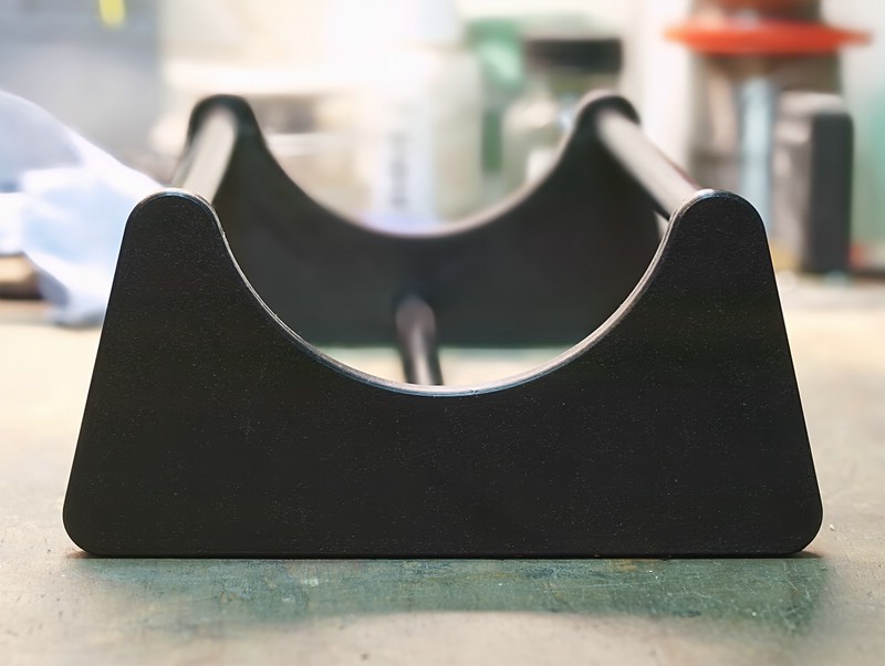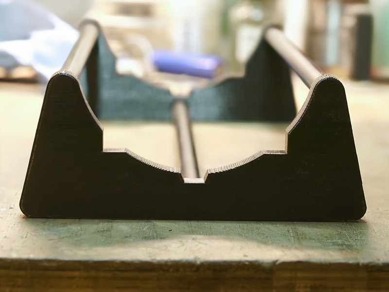 Aber es gibt noch ein weiteres Problem. Der Ständer ist zu niedrig. Hat man das Boot im Ständer stehen und will das Heck im Bajonett verriegeln, stößt man mit den Rudern auf den Tisch bevor man die Stellung zum ineinander schieben erreicht hat. Also größte Gefahr für die Ruder. So habe ich jetzt einen neuen Ständer für das Technikgerüst gedruckt und für das Boot einen schönen aus Holz gebaut, mit umlaufender Hohlkehle und kleinem Infoschild.