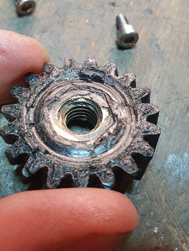 Jetzt musste natürlich für die neue Saison 2025 nachgetrimmt werden. Der Messingpropeller brachte doch einiges mehr an Gewicht, als der Resin Propeller und das noch mit dem längsten Hebel so ganz hinten. Also ging es im April ins Trimmbecken. Einmal Fluten und Lenzen um die Luft aus dem Tank zu bekommen, was den Trimm stört. Dann wieder fluten nach dem Unterschneiden etwas lenzen…etwas mehr lenzen und noch mehr lenzen…, der Getriebemotor surrt aber das Boot bekommt keinen Auftrieb. So ging es wieder in die Werkstatt. Vorsichtig alles wieder zerlegen, denn der Tauchtank ist voll Wasser. Was da zum Vorschein kam hat mich erschrocken. Hat sich das Zahnrad der Gewindespindel vom Kolben auf den Tauchtankdeckel aufgeschmolzen. Dadurch brach dann auch das Ritzel auf der Motorwelle und so konnte der Motor surren aber das Wasser nicht mehr lenzen.