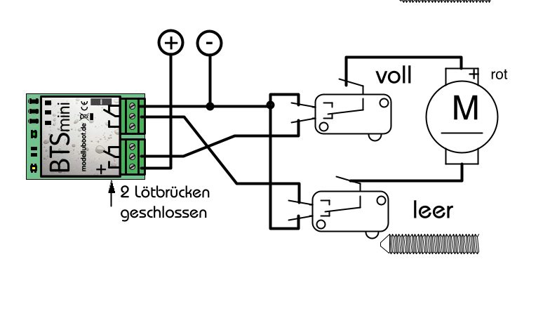 Bei dem ersten Testlauf merkte ich dann, dass der Kolben jeweils an die Enddeckel läuft. Der Kolben ist jetzt ja minimal schneller als vorher. Mein erster Versuch war die Bügel der Endschalter etwas zu verbiegen um ein früheres Abschalten zu erreichen. Aber ich kam nicht weit genug heraus, bzw. hätte den Schalter für `Tank leer´ komplett umsetzen müssen. Da fiel mir ein, dass man bei Alexander Engel und Norbert Brüggen die Schaltung etwas anders aufbaut. Man verwendet dort nicht die Beschaltung mit Dioden an den Endschaltern und nach deren Schaltung bleibt der Motor sofort stehen. Die Beschaltung fand ich dann auch gleich in Norbert Brüggens Anleitung zu seiner BTS Mini.